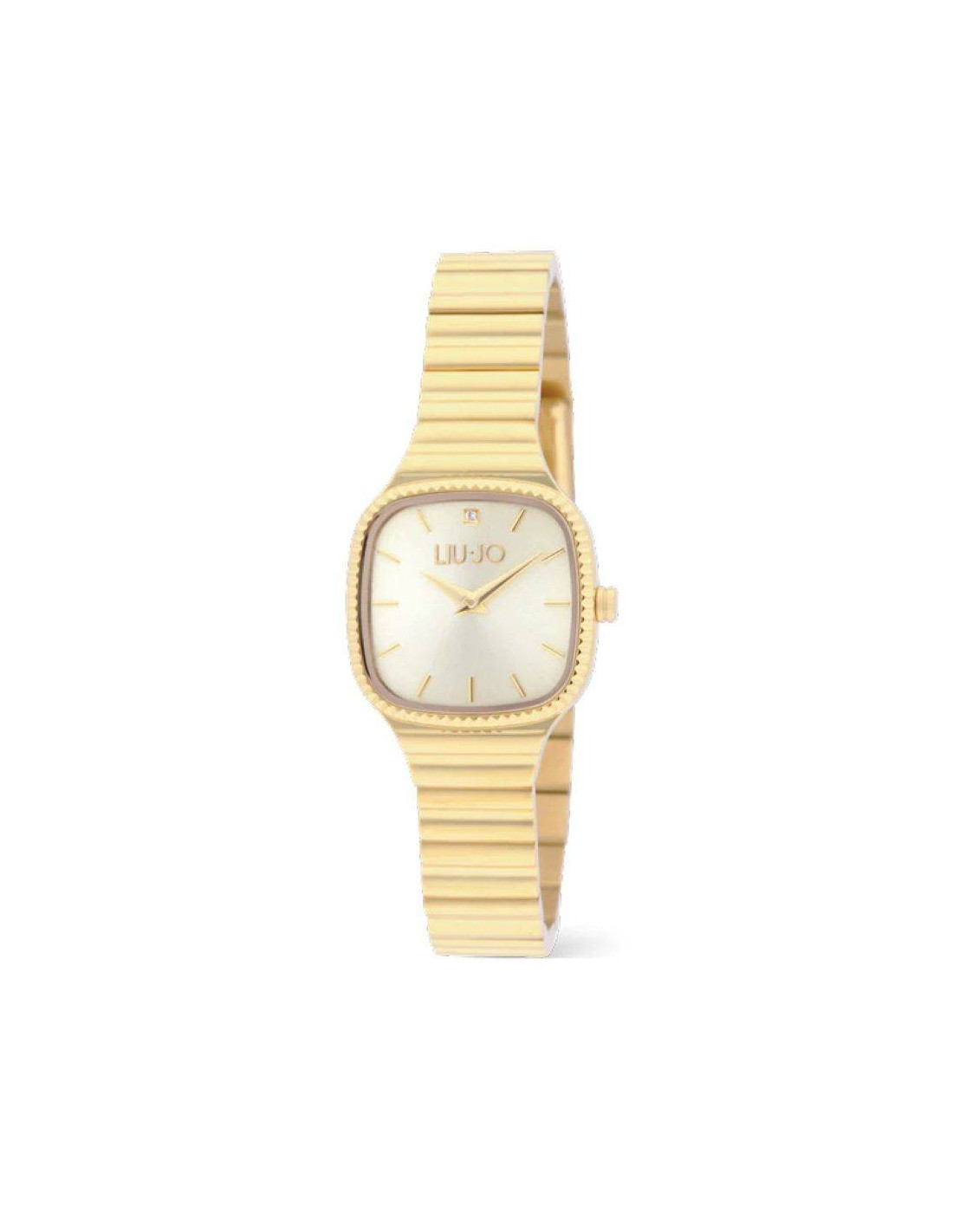 Orologio Liu-Jo Casual Belmira, solo tempo donna. Cassa in acciaio di forma quadrata pvd oro giallo con diametro di 25 mm. Quadrante dorato con indici e lancette dorate, e con cristallo a ore 12. Lunetta zigrinata. Movimento al quarzo e vetro minerale. Cinturino in acciaio pvd oro giallo. Impermeabilità di 5 atm