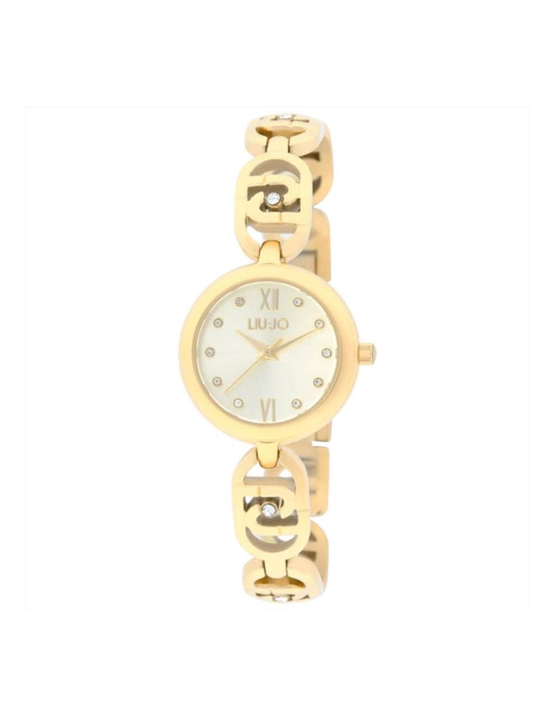 Orologio Liu-Jo Identity Nuvar, solo tempo donna. Cassa in acciaio inossidabile 316L pvd oro giallo da 28 mm. Quadrante dorato con lancette dorate e impreziosito da cristalli al posto degli indici. Vetro minerale e movimento al quarzo. Cinturino in acciaio inossidabile 316L pvd oro giallo con cristalli e con chiusura a scomparsa. Impermeabilità di 3 atm.