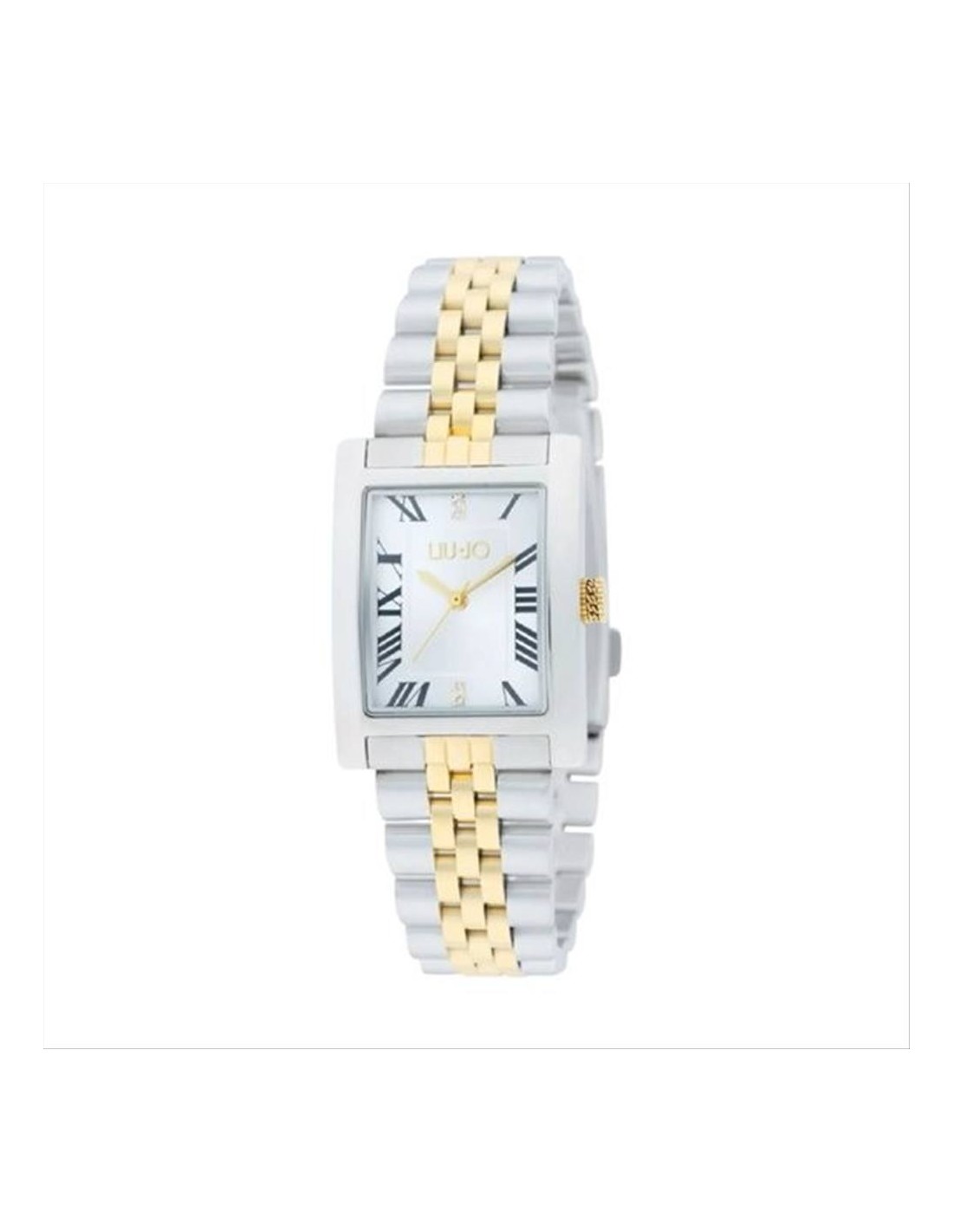 Orologio Liu-Jo Casual Imperia, solo tempo donna. Cassa in acciaio color silver di forma rettangolare con un diametro di 24.5 x 32.5 mm. Quadrante silver con numeri romani e lancette dorate, e cristalli bianchi a ore 12 e a ore 6. Vetro minerale e movimento al quarzo. Cinturino in acciaio bicolore silver e dorato. Impermeabilità di 3 atm.