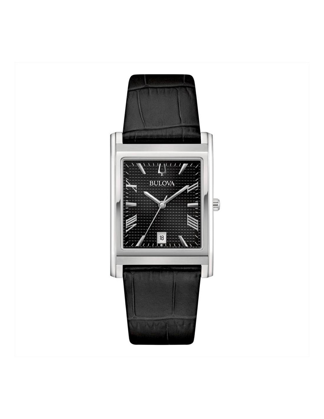 Orologio Bulova Classic Rectangle, solo tempo uomo. Cassa in acciaio di forma rettangolare da 29 mm x 41 mm e ha uno spessore di 6 mm. Quadrante nero quadrettato impreziosito da lancette silver e numeri romani. La finestrella della data è posizionata a ore 6, garantendo funzionalità e stile. Il vetro zaffiro piatto assicura resistenza ai graffi. Movimento al quarzo e cinturino in pelle nero. Impermeabilità di 3 atm.