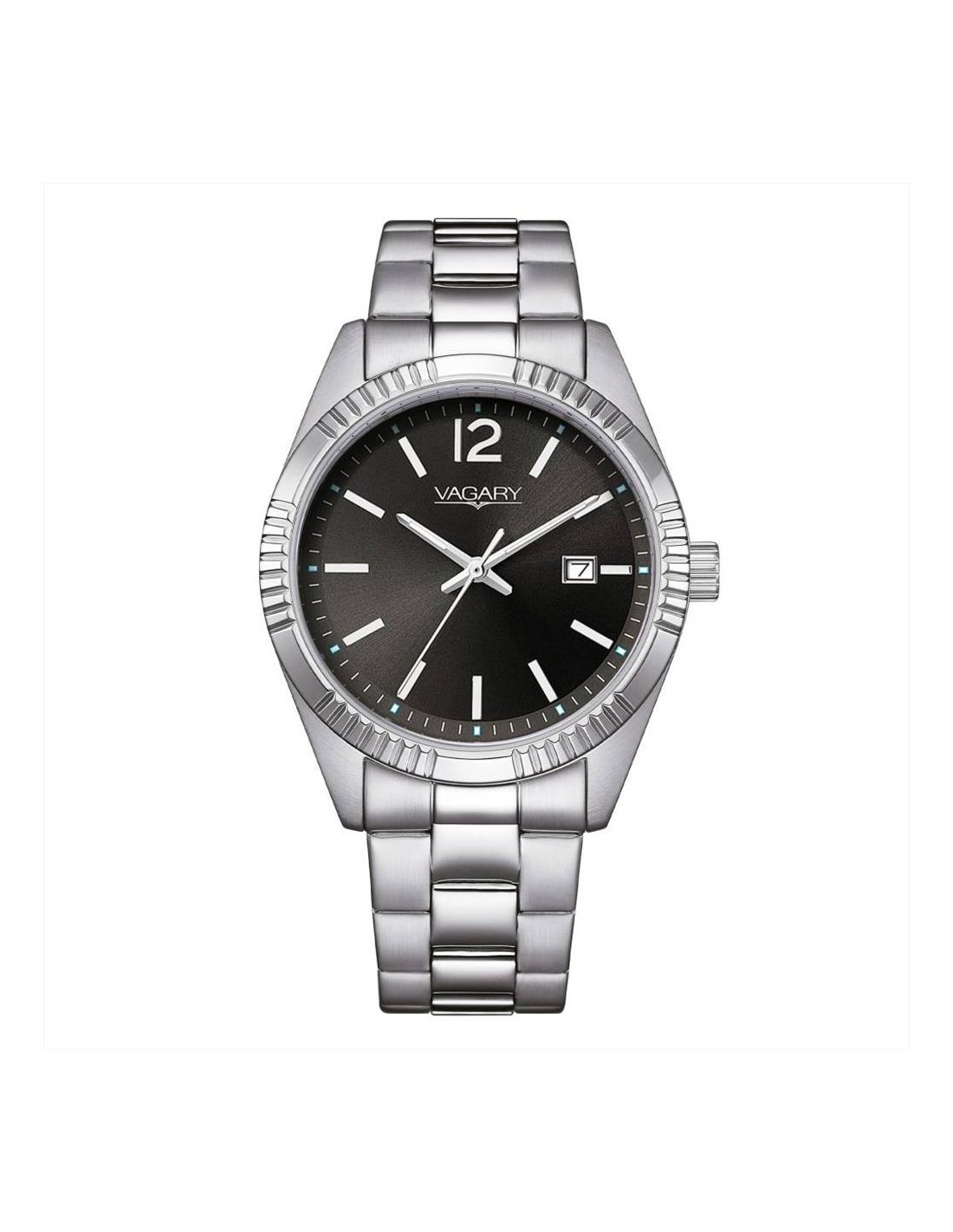 Orologio Vagary Timeless, solo tempo uomo. Cassa in acciaio da 39 mm, quadrante antracite con indici e lancette silver, datario alle ore 3. Lunetta zigrinata. Movimento al quarzo, vetro minerale, e cinturino in acciaio silver. Impermeabilità di 5 atm