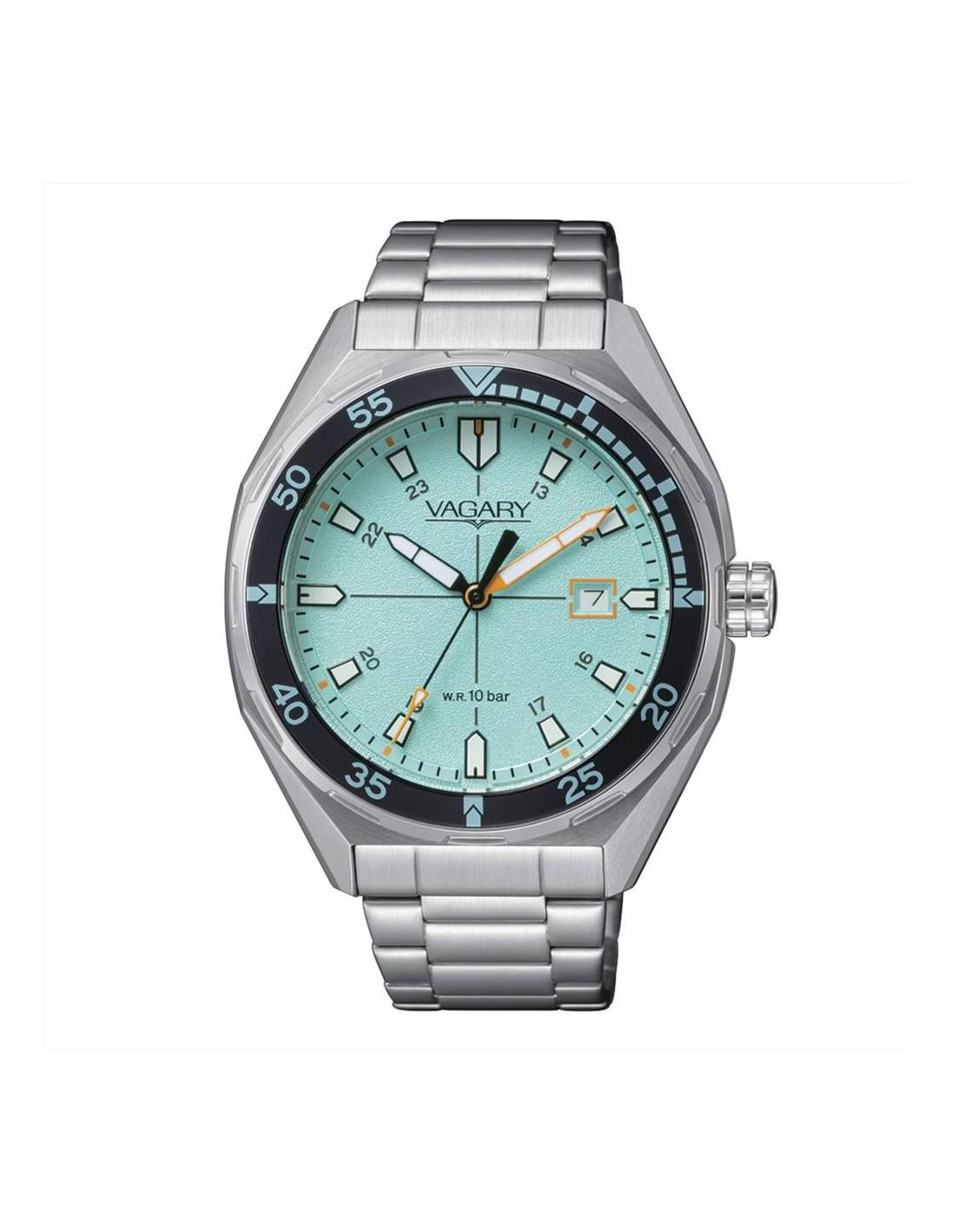 Orologio Vagary Aqua39, solo tempo uomo. Cassa in acciaio da 39 mm, quadrante color verde acqua con indici e lancette luminescenti, datario alle ore 3. Lunetta nera. Movimento al quarzo, vetro minerale, e cinturino in acciaio silver. Impermeabilità di 10 atm.
