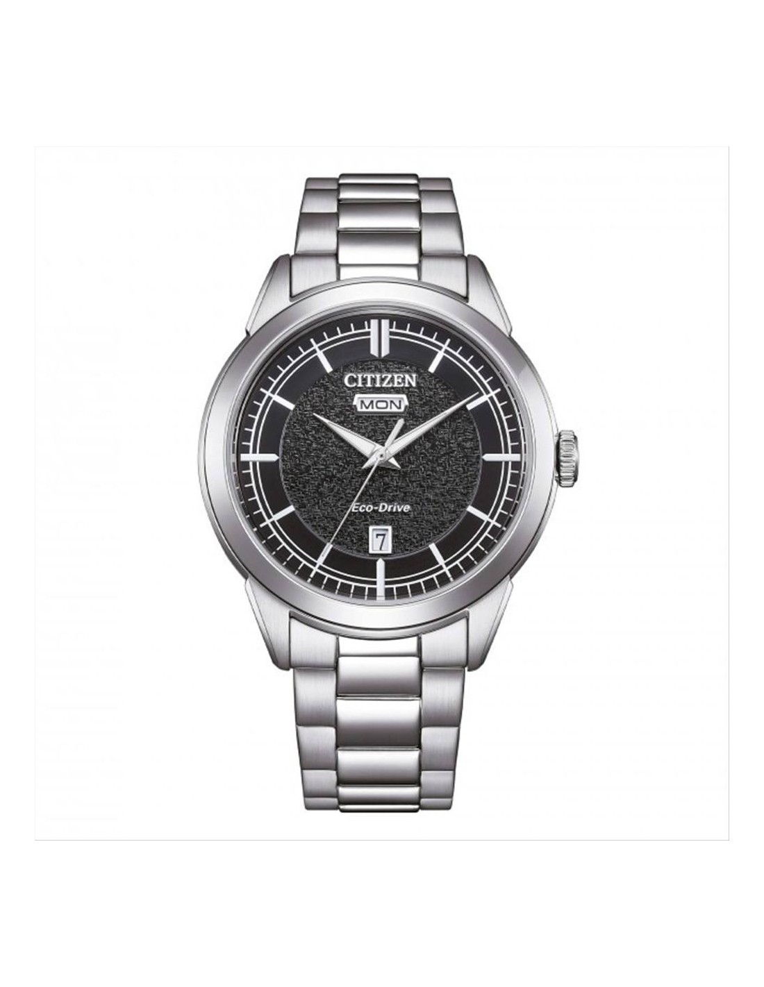 Orologio Citizen Day Date, solo tempo uomo. Cassa in acciaio da 40 mm, quadrante nero con finitura texturizzata e con indici e lancette luminescenti, datario alle ore 6. Vetro minerale. Movimento eco drive a carica luce con riserva di carica di 240 giorni, e cinturino in acciaio. Impermeabilità di 10 atm.