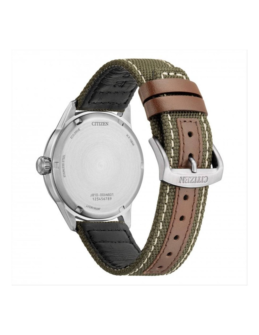 Orologio Citizen Field, solo tempo uomo. Cassa in acciaio da 40 mm, quadrante bianco, numeri arabi neri e lancette luminescenti, datario alle ore 3. Vetro minerale. Movimento eco drive a carica luce con riserva di carica di 8 mesi, e cinturino in nylon verde con inserti in pelle marrone e cuciture bianche. Impermeabilità di 10 atm.