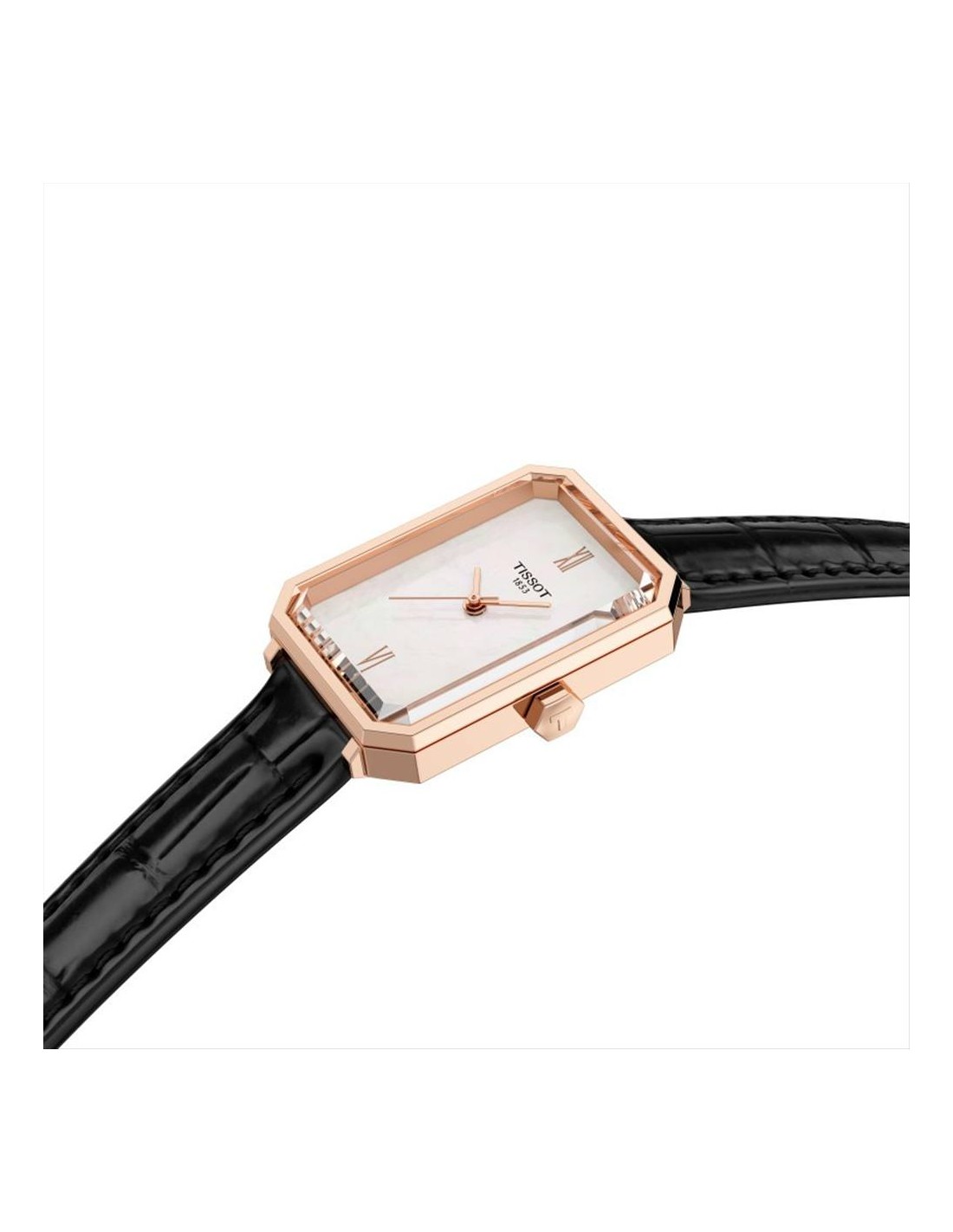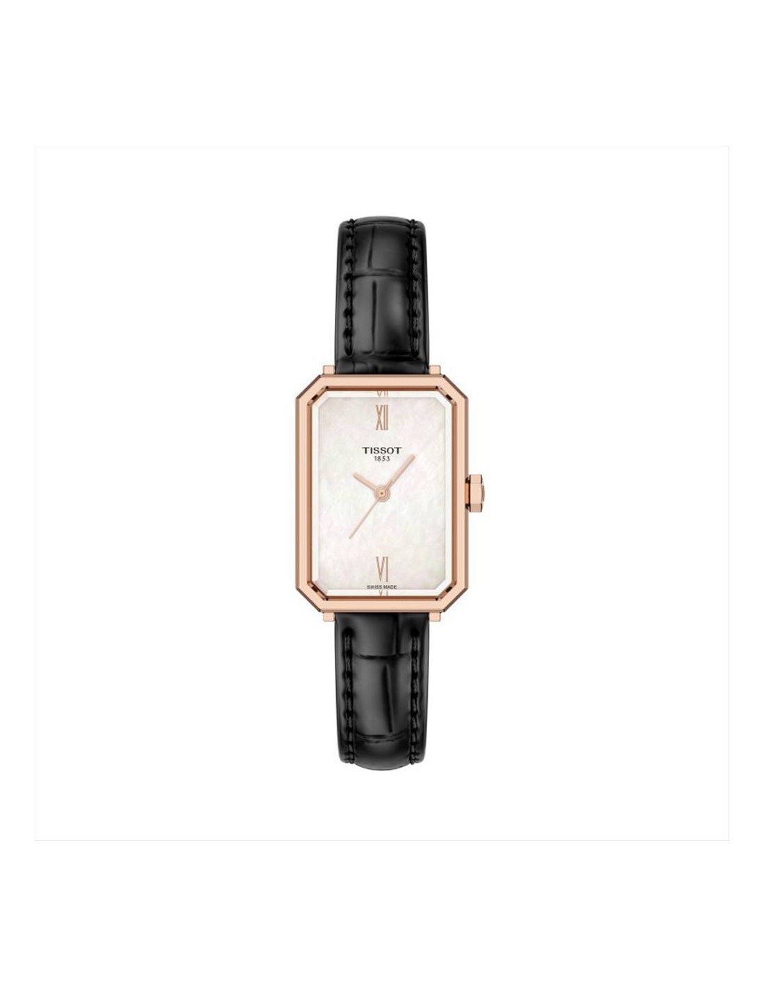 Orologio Tissot SRV, solo tempo donna. Si ispira all'Art Déco degli anni '20, epoca caratterizzata da forme geometriche e motivi astratti. Più che un nome, SRV sta per Sapphire Rectangle V: un vetro zaffiro sfaccettato con una silhouette rettangolare, e la "V" un omaggio alla sua impermeabilità di 5 bar, simboleggiata dal numero romano 5. Cassa in acciaio inossidabile pvd oro rosa di forma rettangolare da 21,8 x 30 mm, quadrante in madreperla bianca con lancette rosè. Movimento al quarzo svizzero. Vetro zaffiro antigraffio. Cinturino in pelle nero.
