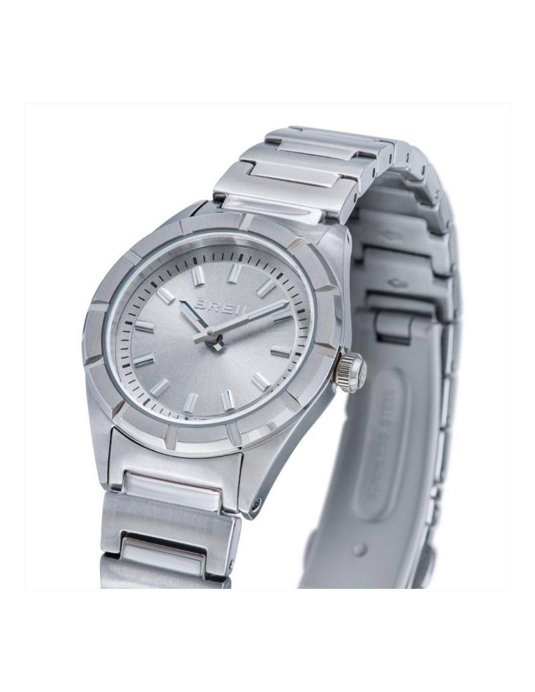 Orologio Breil B 12 H, solo tempo donna. Cassa in acciaio da 26,5mm, quadrante silver con indici e lancette luminescenti. Lunetta satinata impreziosita da 12 intagli lucidi. Vetro minerale e movimento al quarzo. Cinturino in acciaio e impermeabilità di 5 atm.