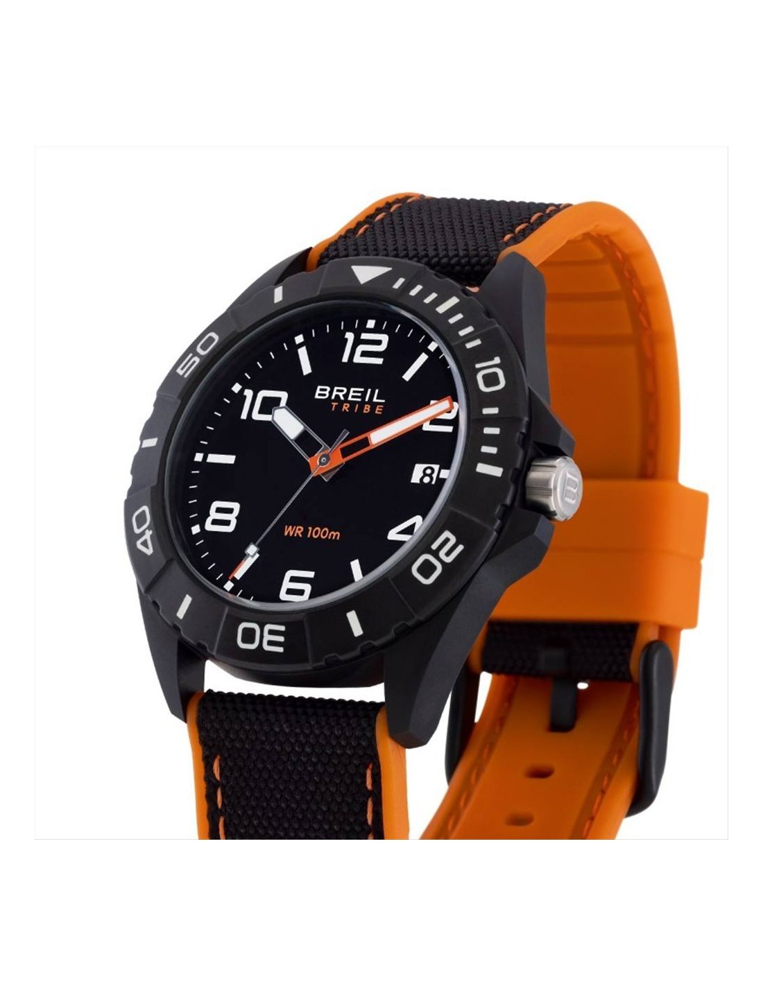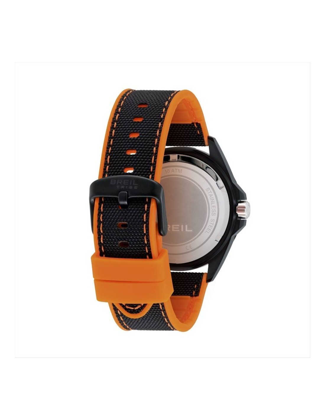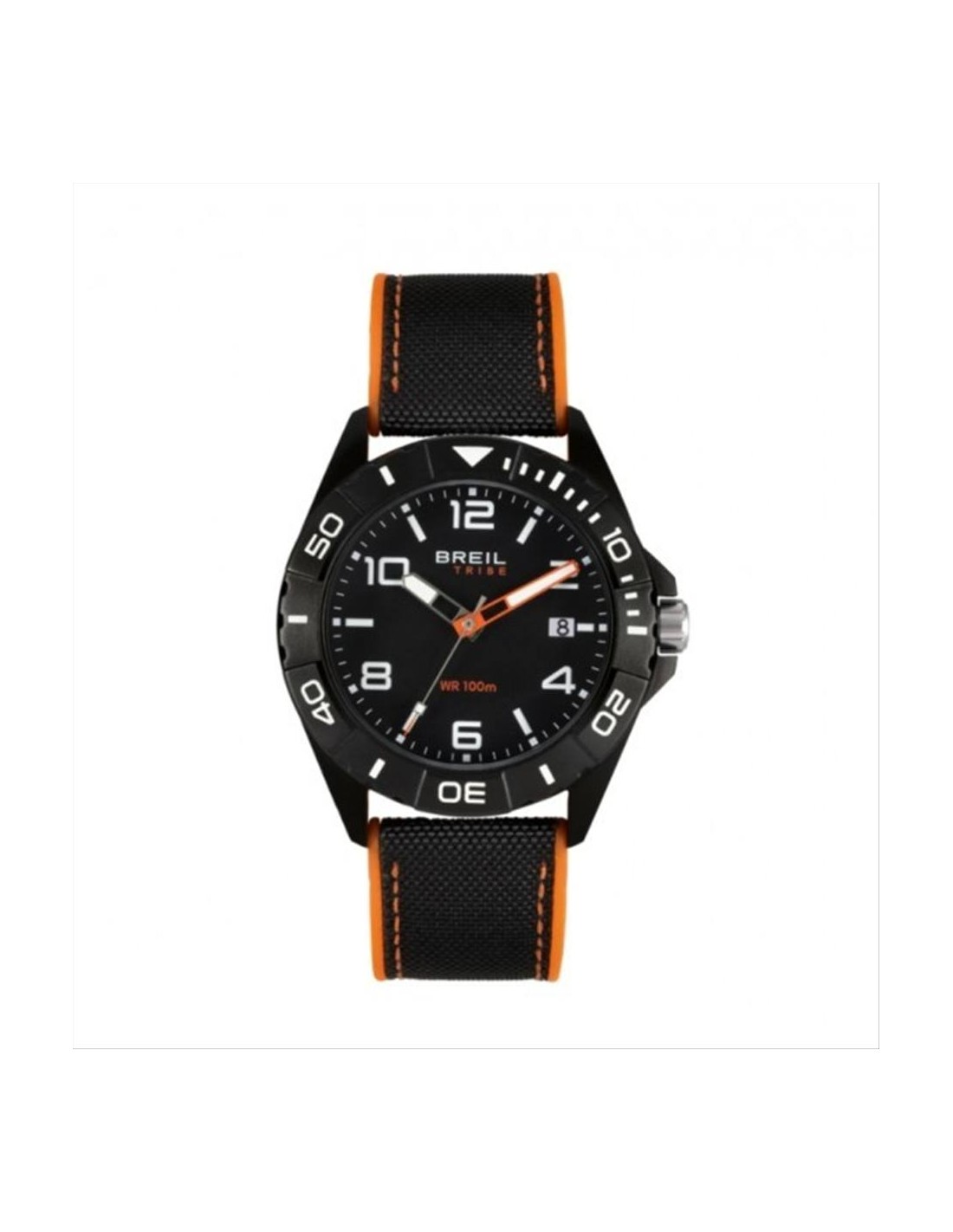 Orologio Breil Tribe Black Horizon, solo tempo uomo. Cassa in acciaio nero dal diametro di 41 mm. Quadrante nero opaco con numeri arabi e lancette luminescenti. Datario a ore 3. Ghiera girevole unidirezionale in acciaio black, con dettagli luminescenti bianchi a contrasto per una perfetta leggibilità.Vetro minerale e movimento al quarzo. Cinturino in silicone arancione e nylon nero. Impermeabilità di 10 atm.