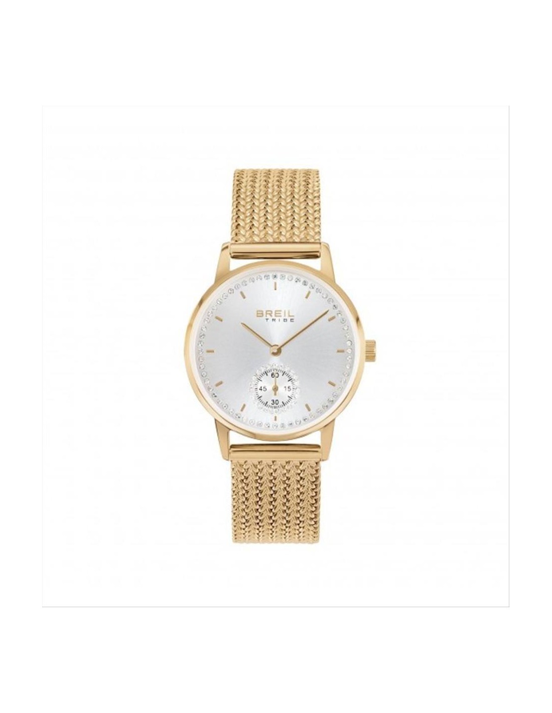 Orologio Breil Tribe Drop, solo tempo donna. Cassa in acciaio pvd oro giallo dal diametro di 41 mm. Quadrante silver con indici e lancette dorate, e cristalli. Vetro minerale e movimento al quarzo. Cinturino maglia milano in acciaio pvd oro giallo. Impermeabilità di 5 atm.