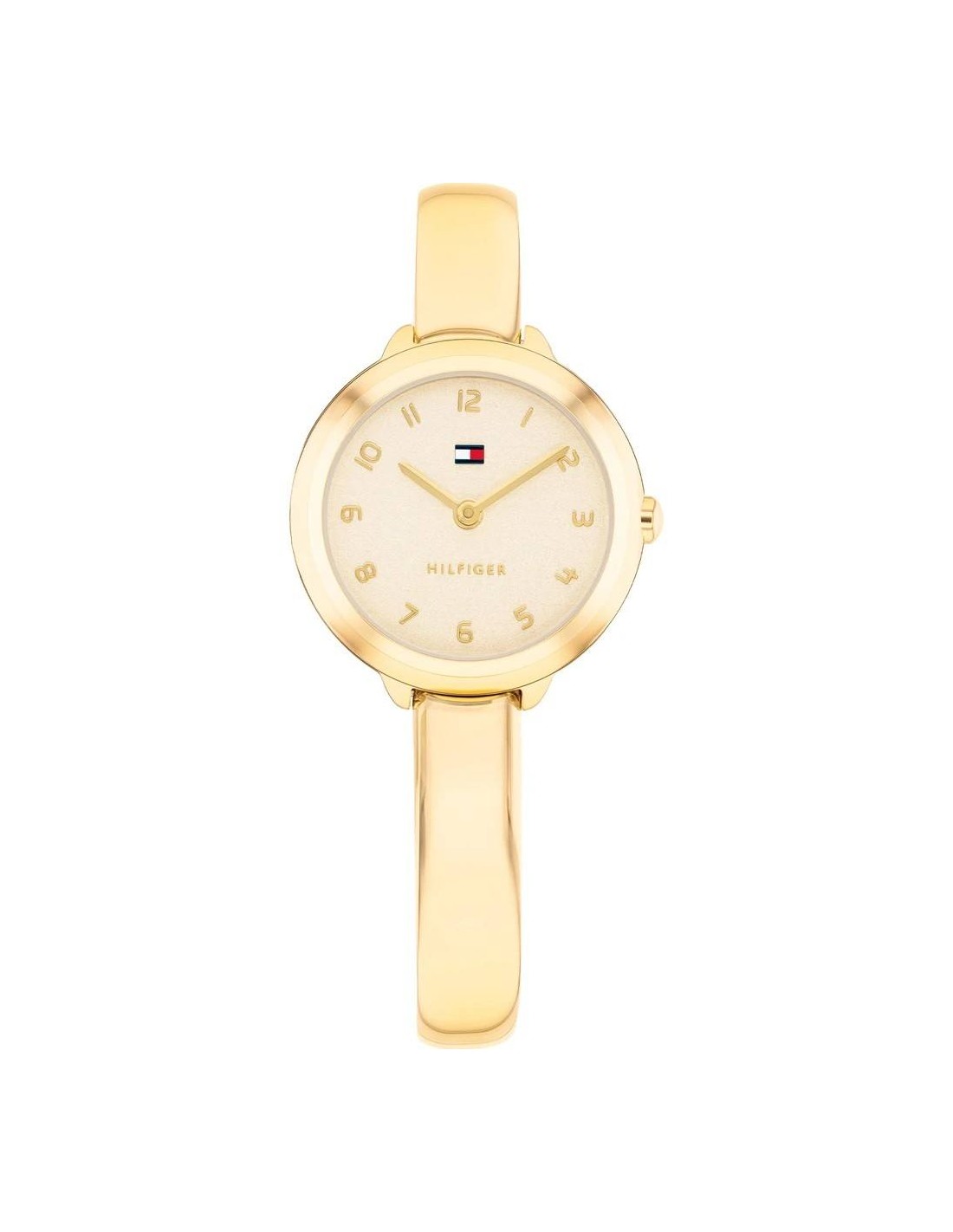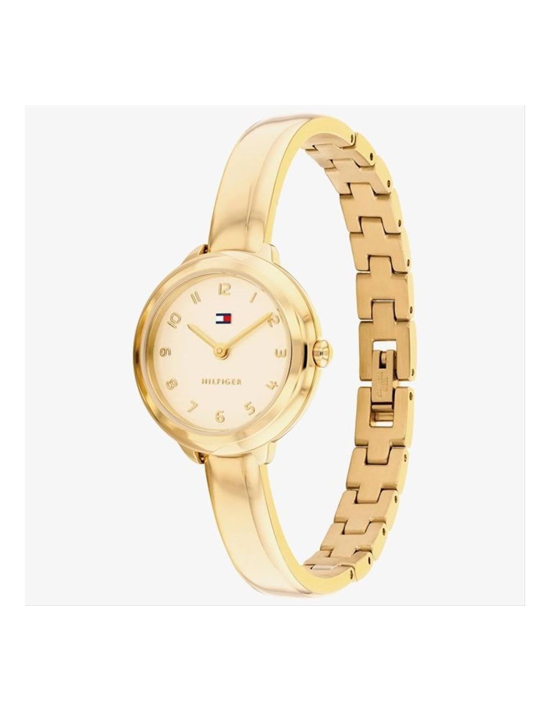 Orologio Tommy Hilfiger Demi Bangle, solo tempo donna. Cassa in acciaio pvd oro giallo da 26 mm, quadrante dorato con numeri arabi e lancette dorate. Vetro minerale e movimento al quarzo. Cinturino rigido in acciaio pvd oro giallo. Impermeabilità di 3 atm.