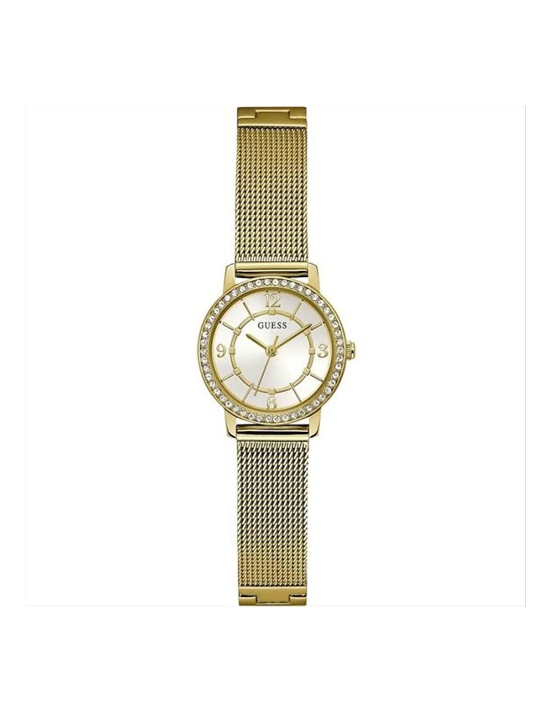 Orologio Guess Melody, solo tempo donna. Cassa rotonda in acciaio pvd oro giallo dal diametro di 28 mm. Quadrante bianco con indici e lancette dorate. Lunetta impreziosita da cristalli bianchi. Vetro minerale e movimento al quarzo. Cinturino in acciaio pvd oro giallo maglia milano. Impermeabilità di 3 atm